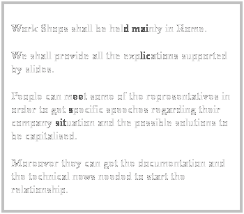 Work Shops shall be held mainly in Rome. We shall provide all the explications supported by slides. People can meet some of the representatives in order to get specific speeches regarding their company situation and the possible solutions to be capitalised. Moreover they can get the documentation and the technical news needed to start the relationship.